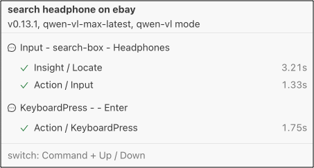 To solve this problem, we have introduced the aiTap(), aiHover(), aiInput(), aiKeyboardPress(), aiScroll() interfaces. They are call the "instant actions". These interfaces will directly perform the specified action as the interface name suggests, while the AI model is responsible for the easier tasks such as locating elements. The whole process can be obviously faster and more reliable after using them.