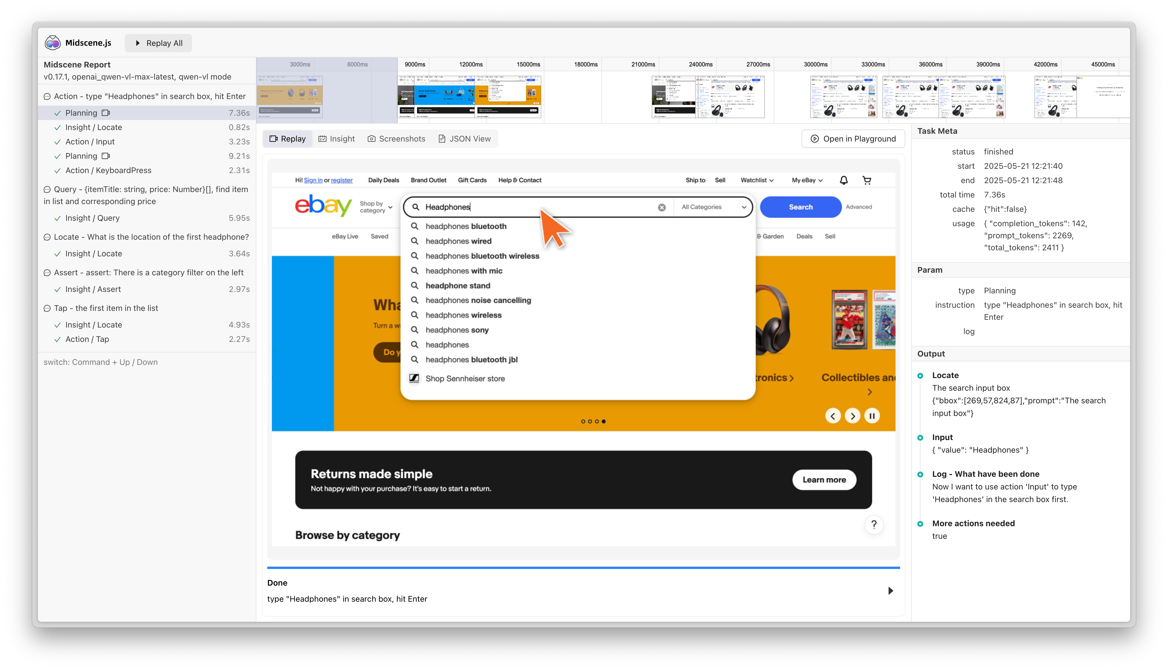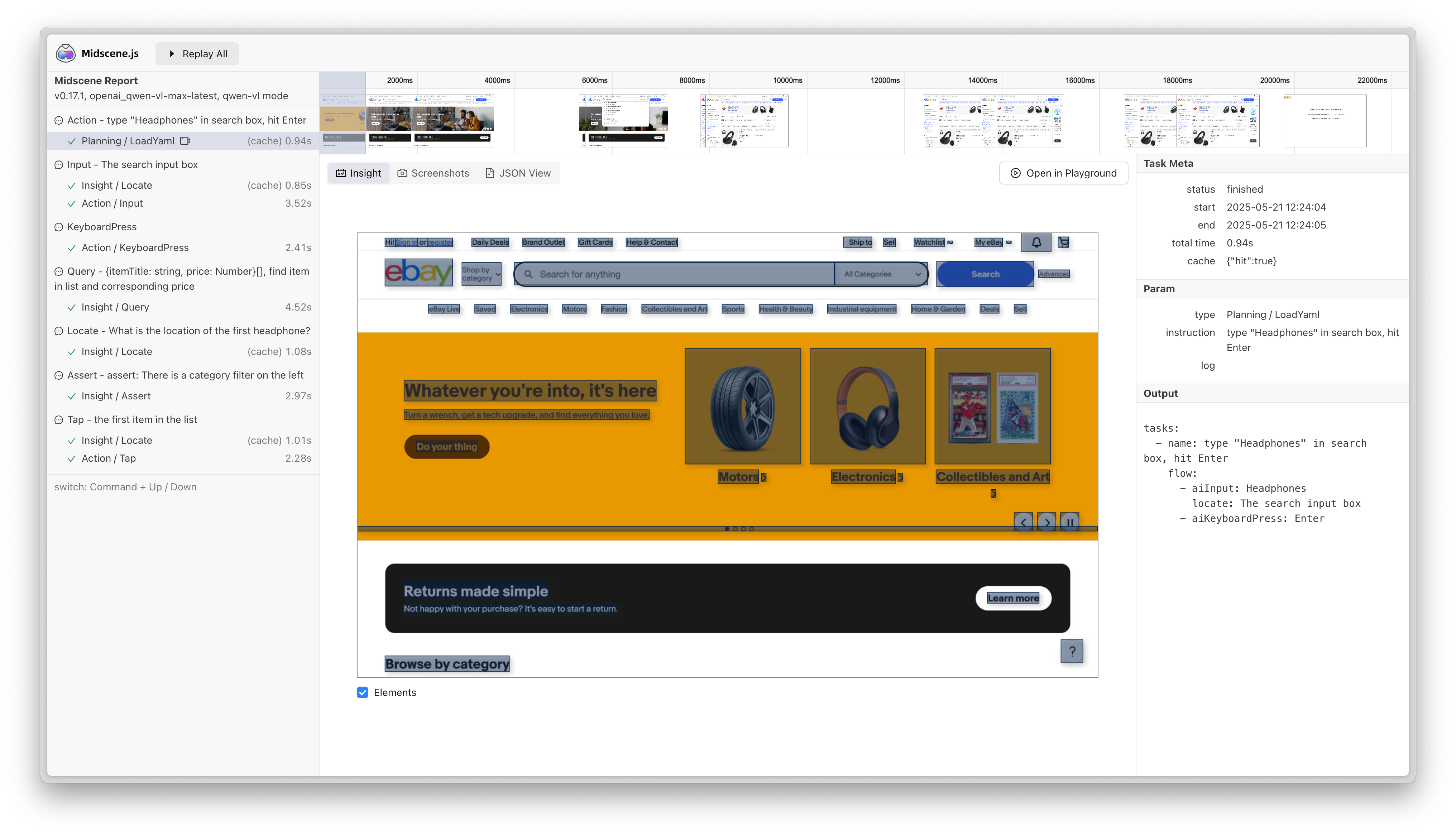 cache: { id: "your-cache-id" } in the constructorcache: true or cache: { id: "your-cache-id" } in fixture configurationagent.cache.id in the YAML fileagent.flushCache() methodcacheId and enable MIDSCENE_CACHE=1 environment variableYou can view the report file. If the cache is hit, you will see the cache tip and the time cost is obviously reduced.