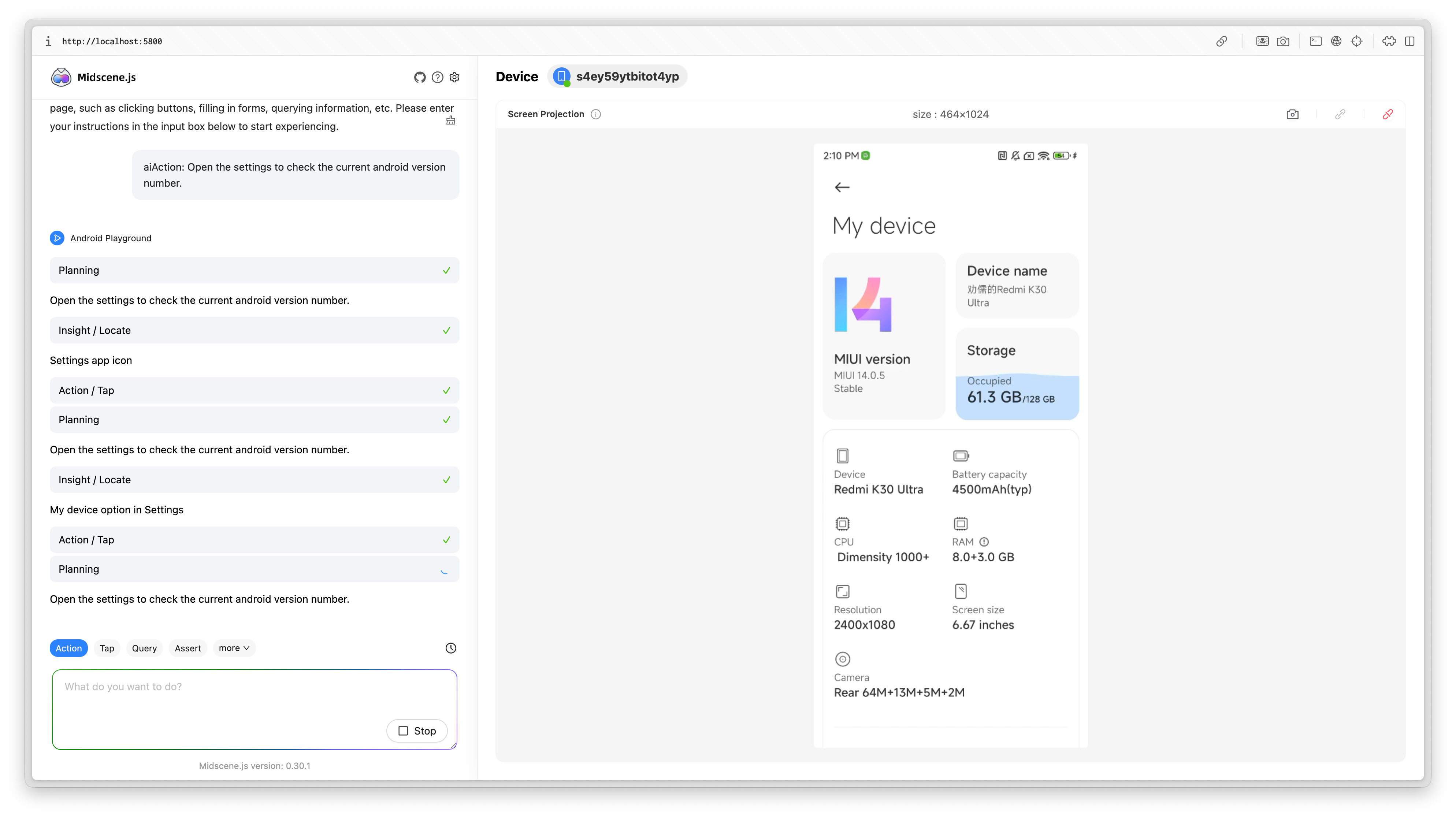 By using Midscene.js playground, you can quickly experience the main features of Midscene on Android devices, without needing to write any code.
